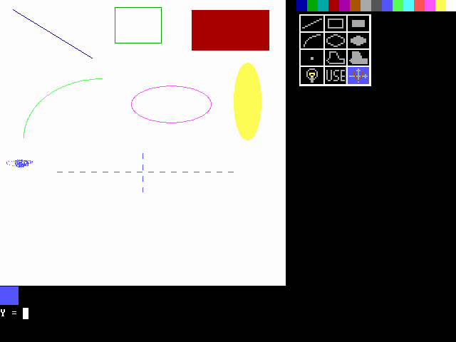 Когда «Корвет» оказался у Шурика дома, там тоже понадобились графические редакторы. Во-первых, портирован Mouse Editor. Во-вторых, доработан Picture: обзавёлся функцией рисования примитивов с клавиатуры, а результат мог сохраняться в собственном векторном формате, так что программа загружала картинку, наглядно повторяя действия пользователя.